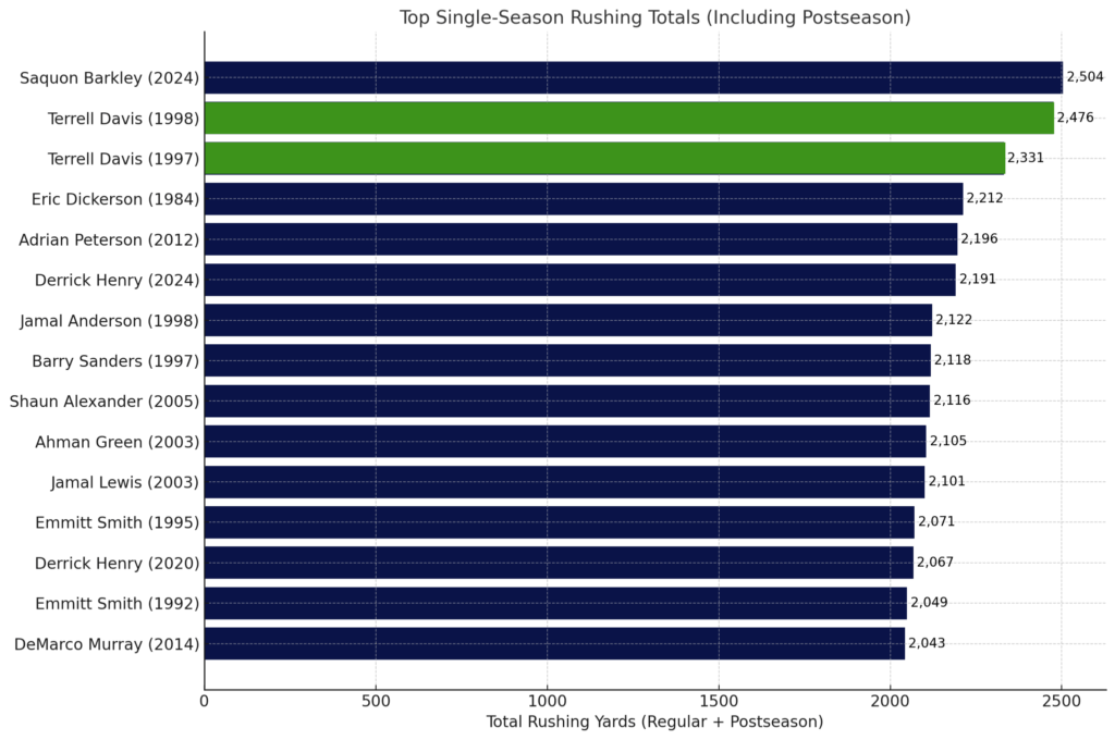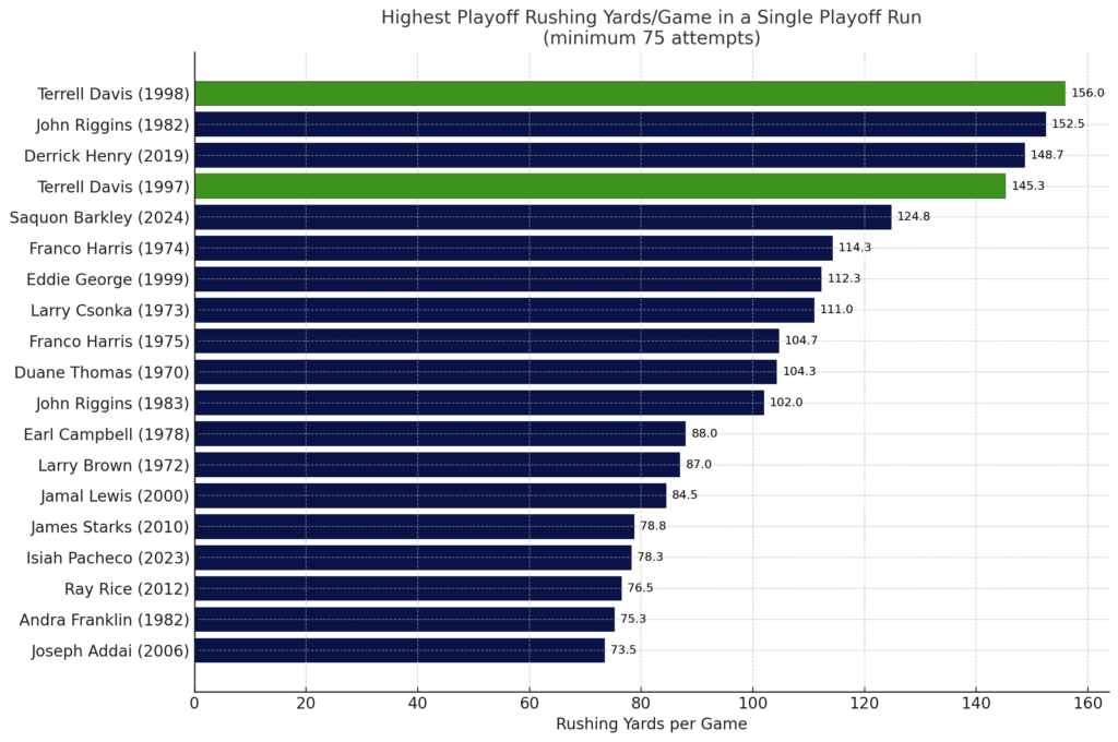 Even in the playoffs alone, his run was unprecedented. Over seven playoff games from 1997 to 1998, Davis ran for 1,049 yards and scored 12 touchdowns. He rushed for at least 100 yards in all seven games. According to Stathead, only John Riggins and Thurman Thomas have more than three consecutive playoff games with 100 rushing yards. Davis went seven for seven.